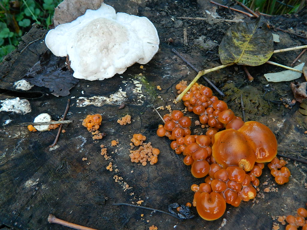 Apoi, pe cealalta buturuga, au crescut doua feluri de ciuperci:Cele albe au pe dedesubt un fel de miceliu (de fapt, cred ca asta si este, dar nu e din acela clasic, cu lamele ca la umbrela):